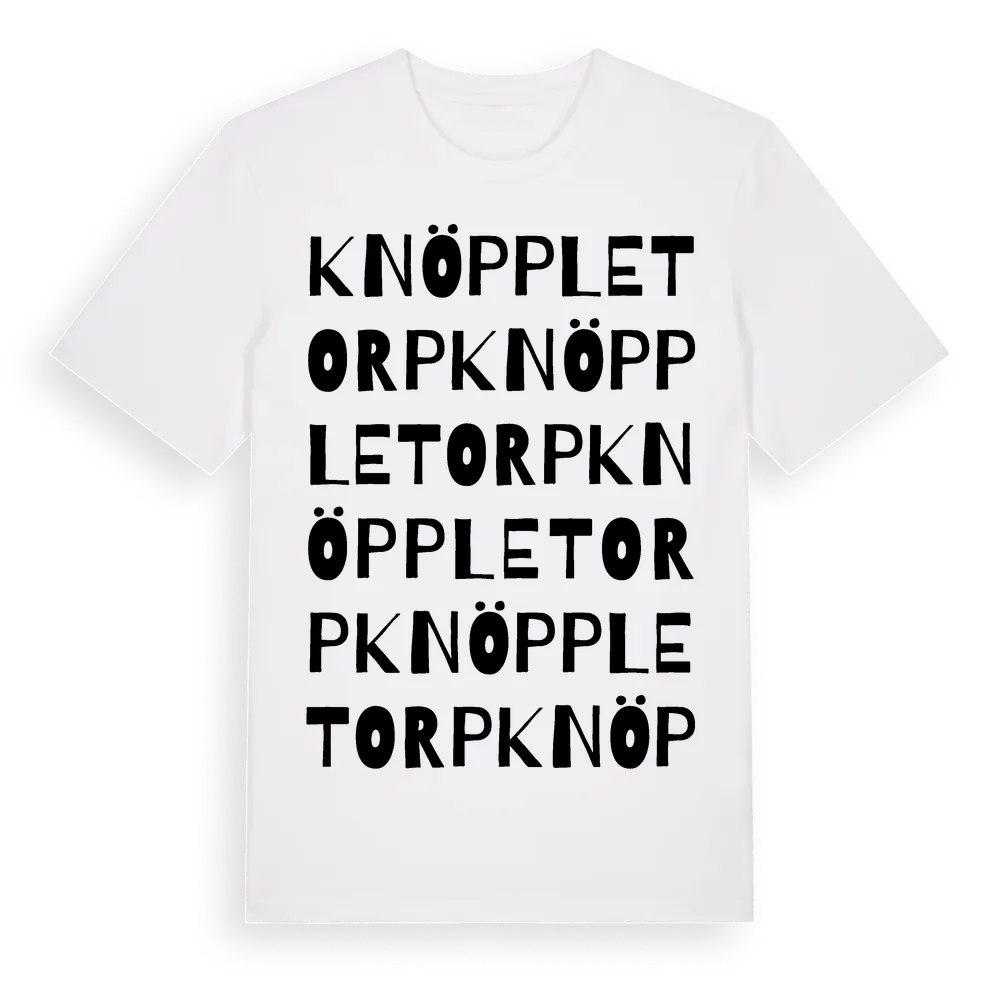 Knöppletorp ordlek t-shirt är inspirerad av byn Knöppletorp i Kalmar län, Sverige. Tröjan är designad för dig som har en speciell koppling till platsen – oavsett om du bor här, har rötterna här eller bara älskar Knöppletorp.