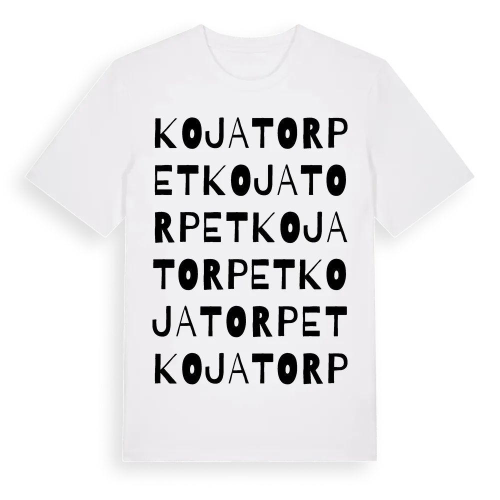 Kojatorpet ordlek t-shirt är inspirerad av Kojatorpet i Kalmar län, Sverige. Tröjan är designad för dig som har en speciell koppling till platsen – oavsett om du bor här, har rötterna här eller bara älskar Kojatorpet.