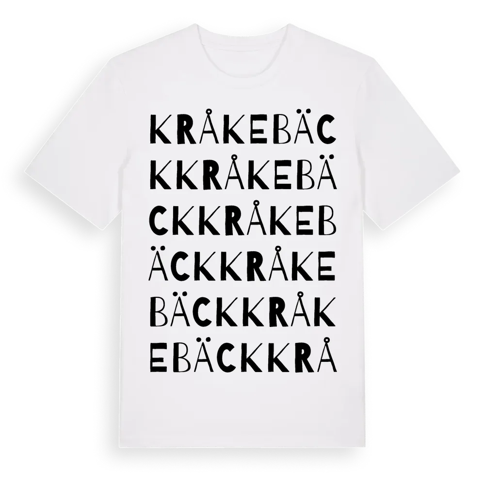 Kråkebäck ordlek t-shirt är inspirerad av byn Kråkebäck i Kalmar län, Sverige. Tröjan är designad för dig som har en speciell koppling till platsen – oavsett om du bor här, har rötterna här eller bara älskar Kråkebäck.