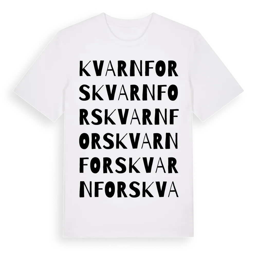 Kvarnfors ordlek t-shirt är inspirerad av byn Kvarnfors i Kalmar län, Sverige. Tröjan är designad för dig som har en speciell koppling till platsen – oavsett om du bor här, har rötterna här eller bara älskar Kvarnfors.