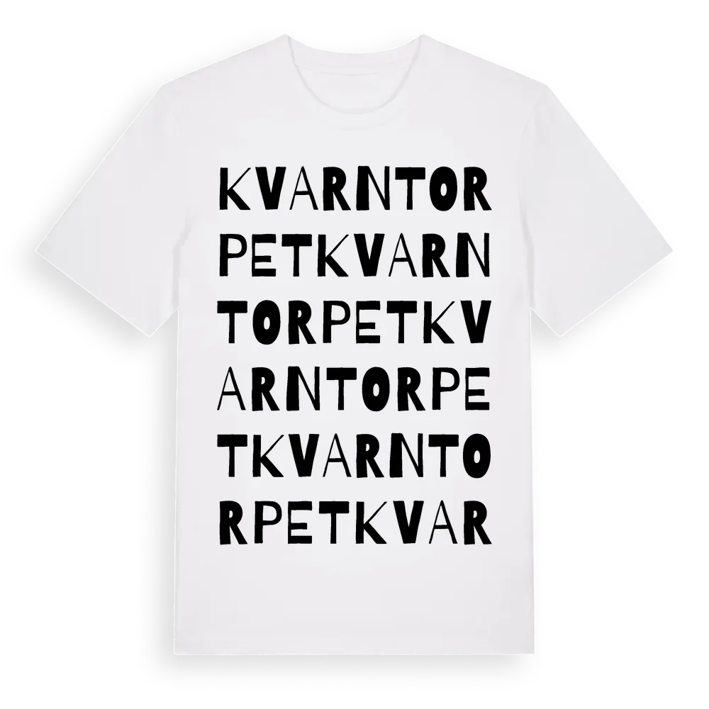 Kvarntorpet ordlek t-shirt är inspirerad av Kvarntorpet i Kalmar län, Sverige. Tröjan är designad för dig som har en speciell koppling till platsen – oavsett om du bor här, har rötterna här eller bara älskar Kvarntorpet.