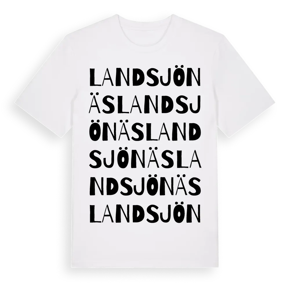 Landsjönäs ordlek t-shirt är inspirerad av Landsjönäs i Kalmar län, Sverige. Tröjan är designad för dig som har en speciell koppling till platsen – oavsett om du bor här, har rötterna här eller bara älskar Landsjönäs.