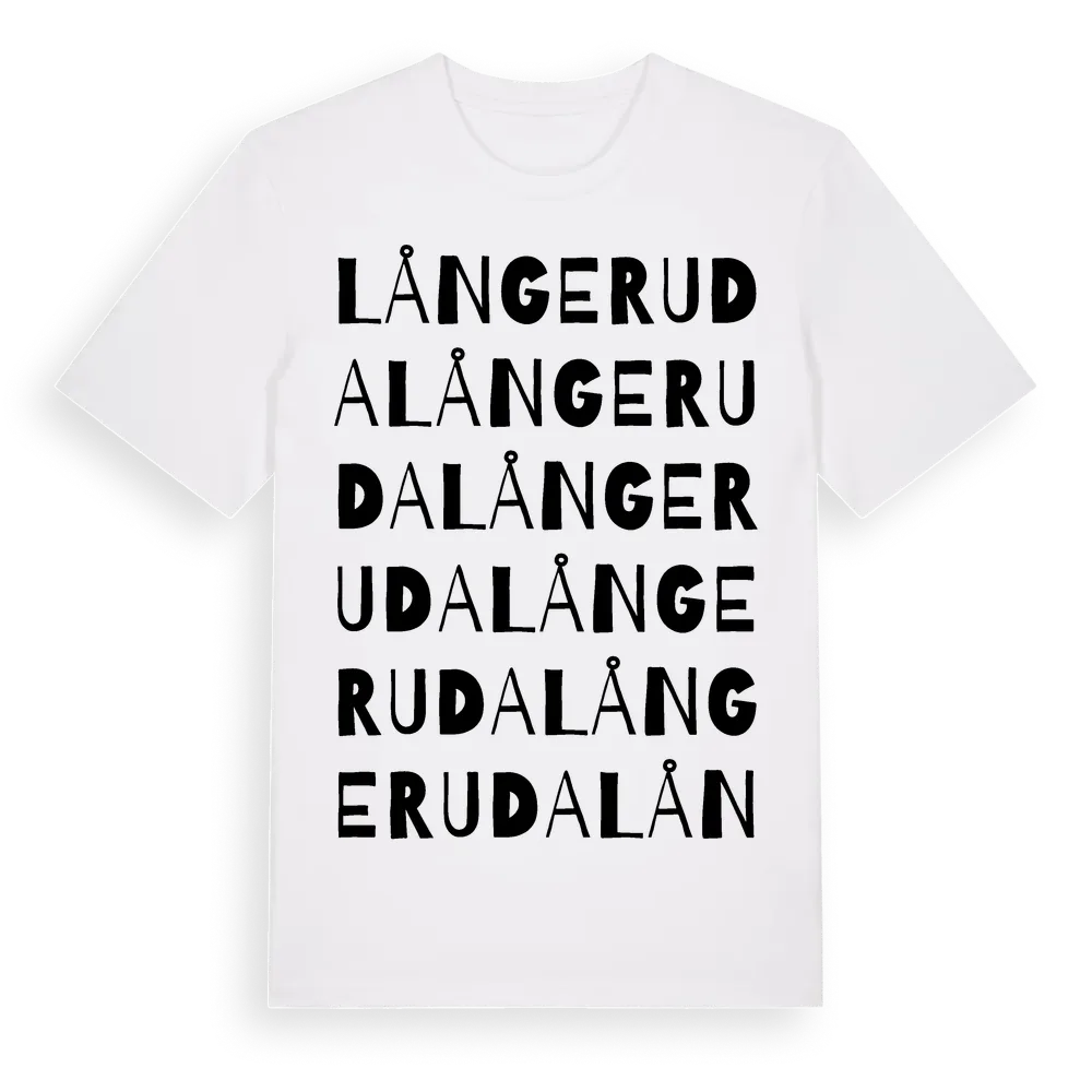 Långeruda ordlek t-shirt är inspirerad av byn Långeruda i Kalmar län, Sverige. Tröjan är designad för dig som har en speciell koppling till platsen – oavsett om du bor här, har rötterna här eller bara älskar Långeruda.