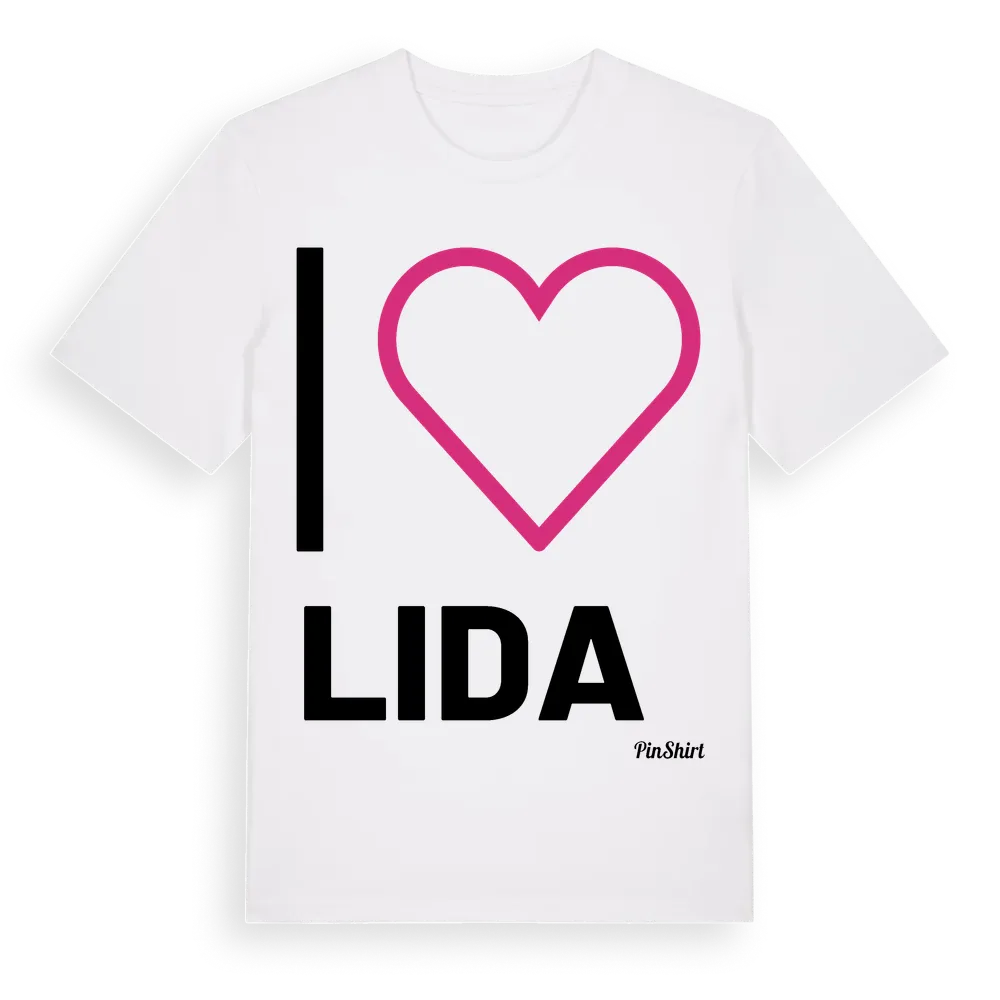 Jag älskar Lida t-shirt stort tryck är inspirerad av byn Lida i Kalmar län, Sverige. Tröjan är designad för dig som har en speciell koppling till platsen – oavsett om du bor här, har rötterna här eller bara älskar Lida.