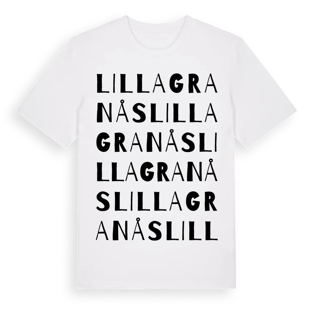 Lilla Granås ordlek t-shirt är inspirerad av Lilla Granås i Kalmar län, Sverige. Tröjan är designad för dig som har en speciell koppling till platsen – oavsett om du bor här, har rötterna här eller bara älskar Lilla Granås.
