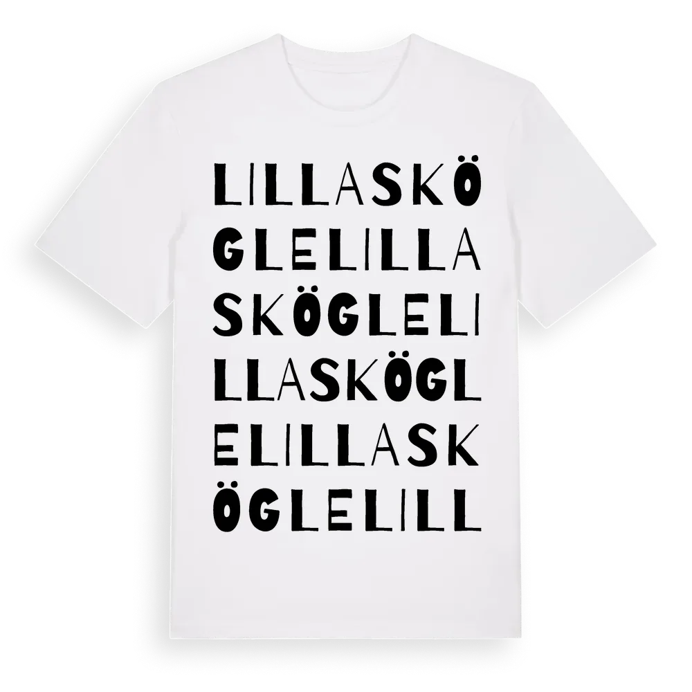 Lilla Skögle ordlek t-shirt är inspirerad av Lilla Skögle i Kalmar län, Sverige. Tröjan är designad för dig som har en speciell koppling till platsen – oavsett om du bor här, har rötterna här eller bara älskar Lilla Skögle.