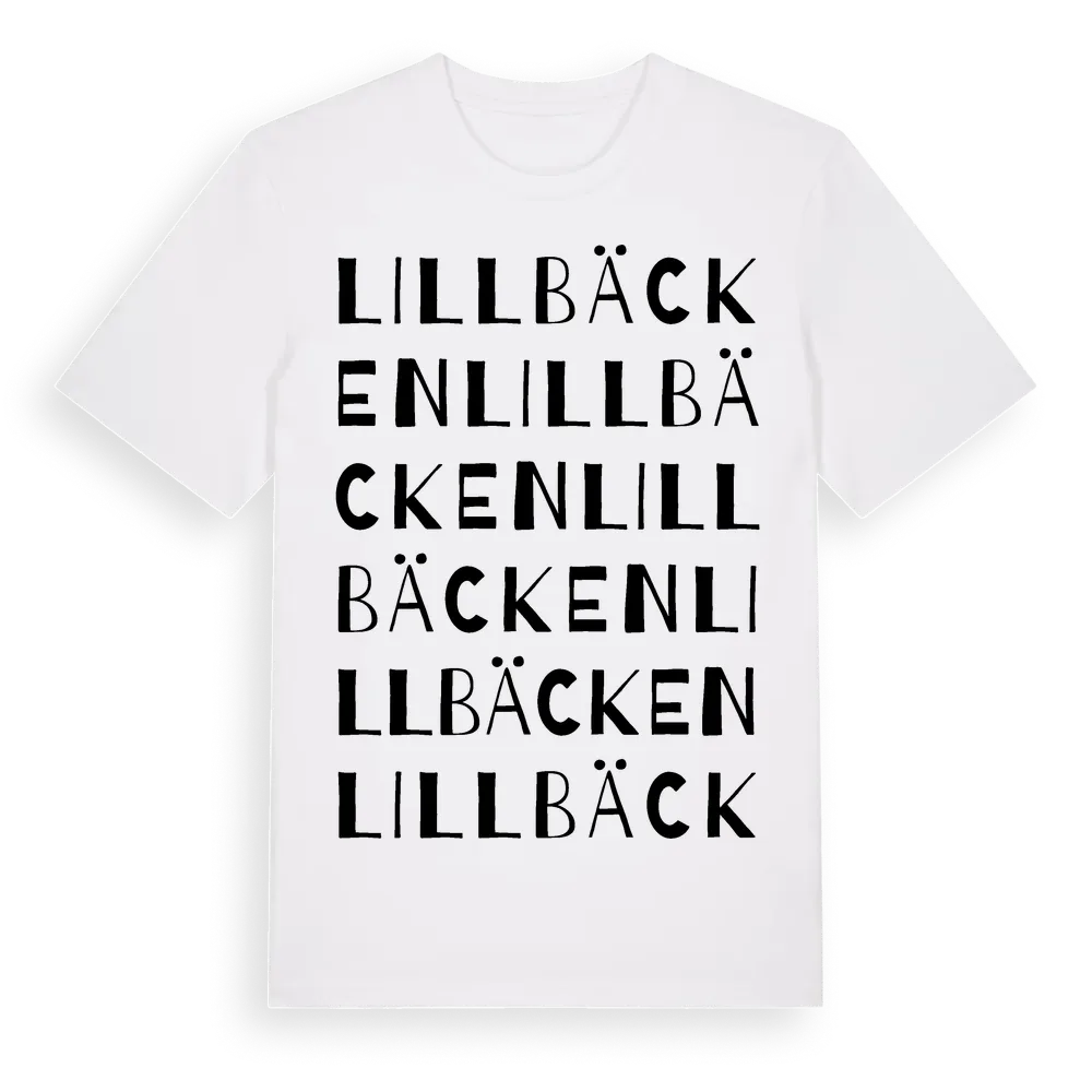 Lillbäcken ordlek t-shirt är inspirerad av Lillbäcken i Kalmar län, Sverige. Tröjan är designad för dig som har en speciell koppling till platsen – oavsett om du bor här, har rötterna här eller bara älskar Lillbäcken.