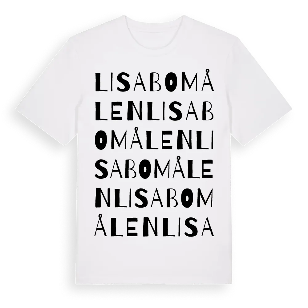 Lisabomålen ordlek t-shirt är inspirerad av Lisabomålen i Kalmar län, Sverige. Tröjan är designad för dig som har en speciell koppling till platsen – oavsett om du bor här, har rötterna här eller bara älskar Lisabomålen.