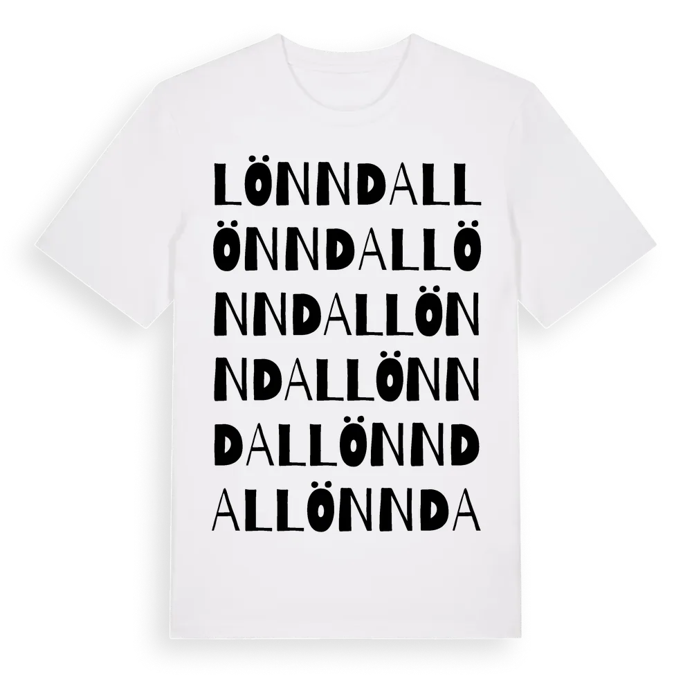 Lönndal ordlek t-shirt är inspirerad av byn Lönndal i Kalmar län, Sverige. Tröjan är designad för dig som har en speciell koppling till platsen – oavsett om du bor här, har rötterna här eller bara älskar Lönndal.