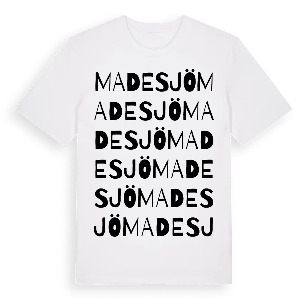 Madesjö ordlek t-shirt är inspirerad av stadsdelen Madesjö i Kalmar län, Sverige. Tröjan är designad för dig som har en speciell koppling till platsen – oavsett om du bor här, har rötterna här eller bara älskar Madesjö.