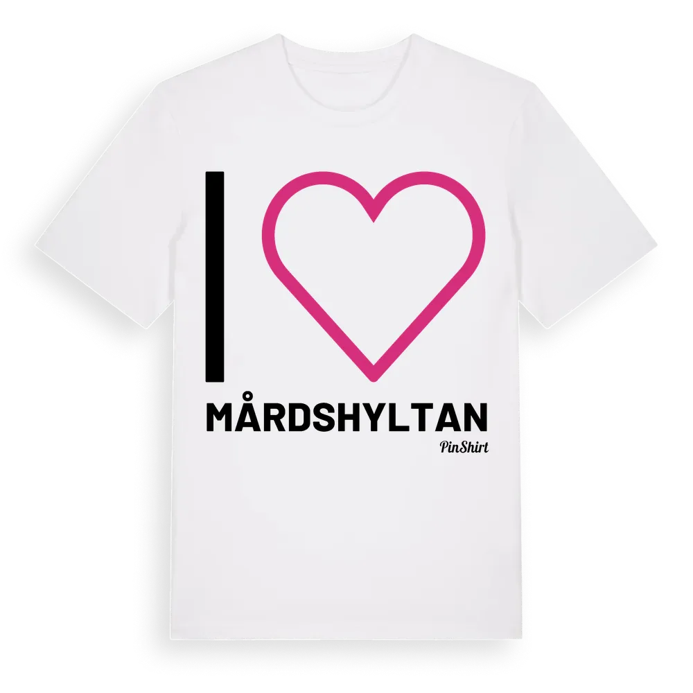 Det klassiska "I ❤ Mårdshyltan"-motivet i stort format som täcker hela bröstet. För dig som vill visa kärleken till Mårdshyltan på riktigt. Premium bomull, unisex – från byn Mårdshyltan i Kalmar län.