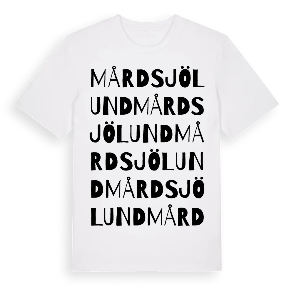 Mårdsjölund ordlek t-shirt är inspirerad av Mårdsjölund i Kalmar län, Sverige. Tröjan är designad för dig som har en speciell koppling till platsen – oavsett om du bor här, har rötterna här eller bara älskar Mårdsjölund.