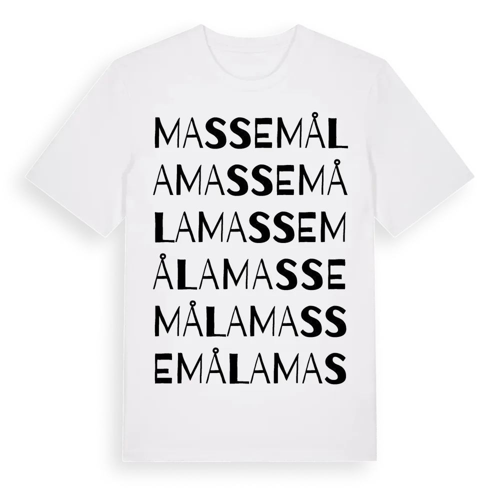 Massemåla ordlek t-shirt är inspirerad av Massemåla i Kalmar län, Sverige. Tröjan är designad för dig som har en speciell koppling till platsen – oavsett om du bor här, har rötterna här eller bara älskar Massemåla.