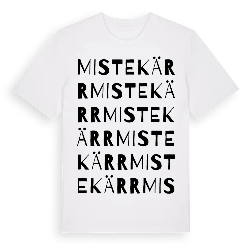 Mistekärr ordlek t-shirt är inspirerad av byn Mistekärr i Kalmar län, Sverige. Tröjan är designad för dig som har en speciell koppling till platsen – oavsett om du bor här, har rötterna här eller bara älskar Mistekärr.