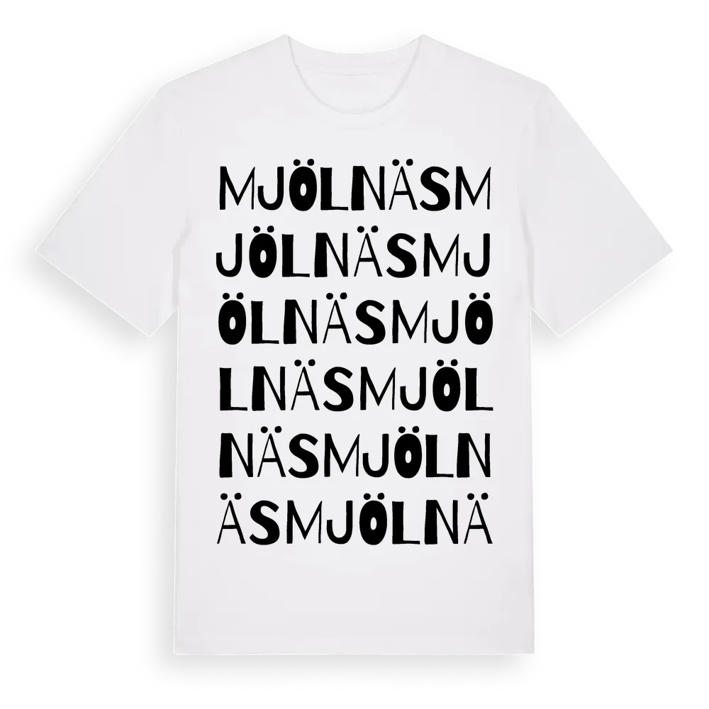 Mjölnäs ordlek t-shirt är inspirerad av Mjölnäs i Kalmar län, Sverige. Tröjan är designad för dig som har en speciell koppling till platsen – oavsett om du bor här, har rötterna här eller bara älskar Mjölnäs.