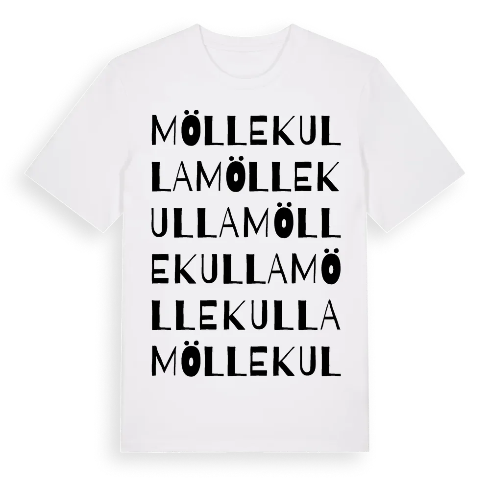 Möllekulla ordlek t-shirt är inspirerad av byn Möllekulla i Kalmar län, Sverige. Tröjan är designad för dig som har en speciell koppling till platsen – oavsett om du bor här, har rötterna här eller bara älskar Möllekulla.