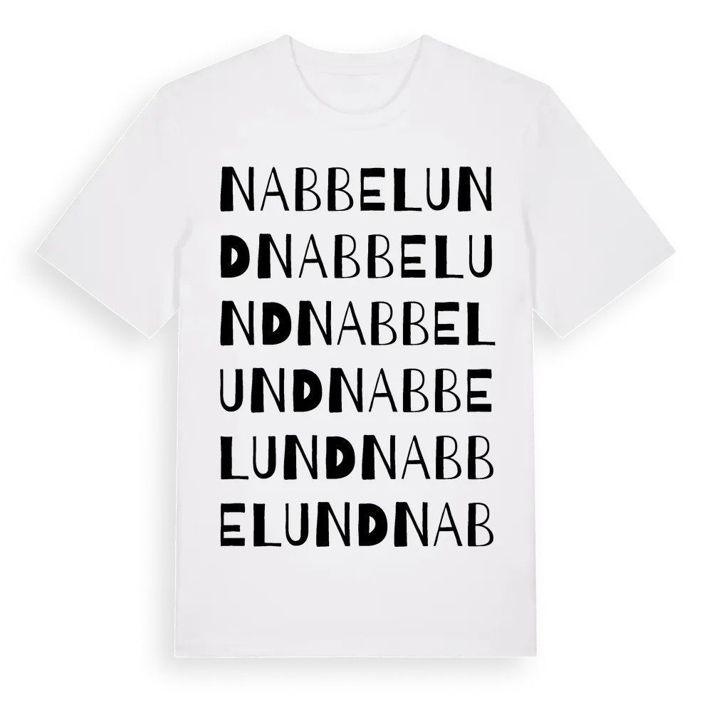 Nabbelund ordlek t-shirt är inspirerad av byn Nabbelund i Kalmar län, Sverige. Tröjan är designad för dig som har en speciell koppling till platsen – oavsett om du bor här, har rötterna här eller bara älskar Nabbelund.
