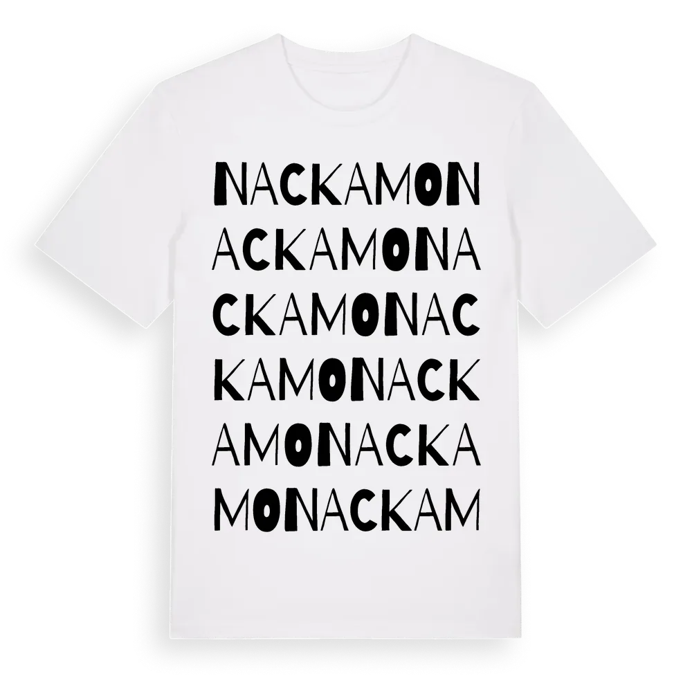 Nackamo ordlek t-shirt är inspirerad av Nackamo i Kalmar län, Sverige. Tröjan är designad för dig som har en speciell koppling till platsen – oavsett om du bor här, har rötterna här eller bara älskar Nackamo.