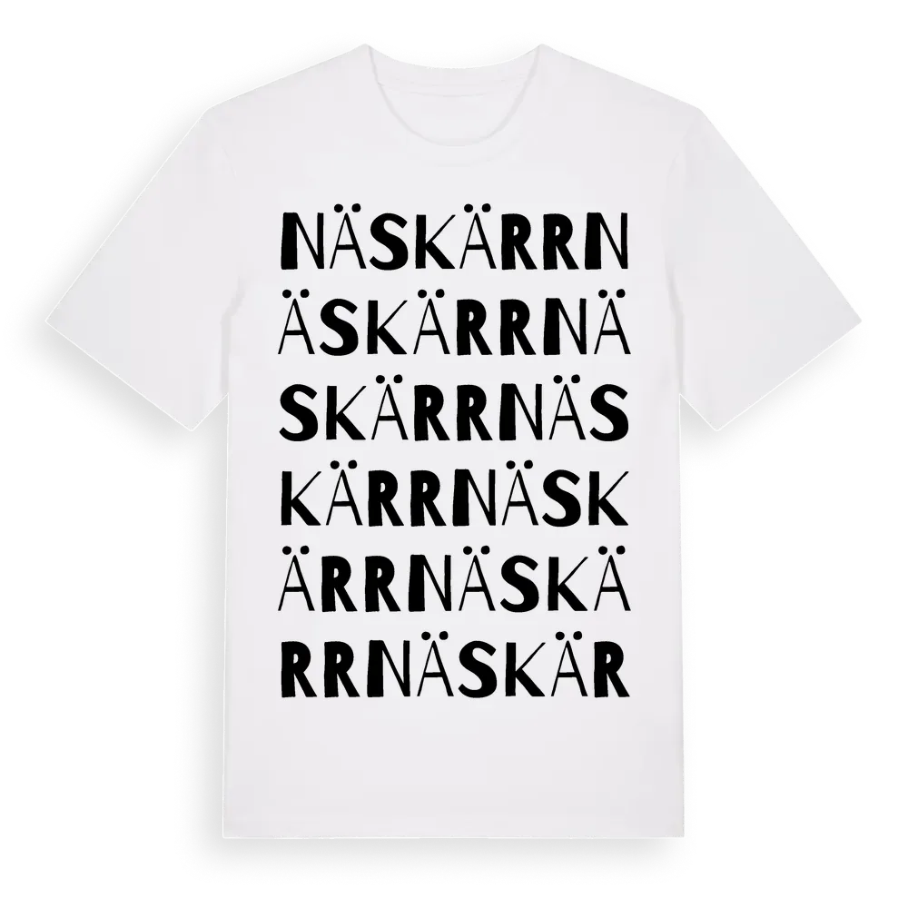 Näskärr ordlek t-shirt är inspirerad av Näskärr i Kalmar län, Sverige. Tröjan är designad för dig som har en speciell koppling till platsen – oavsett om du bor här, har rötterna här eller bara älskar Näskärr.