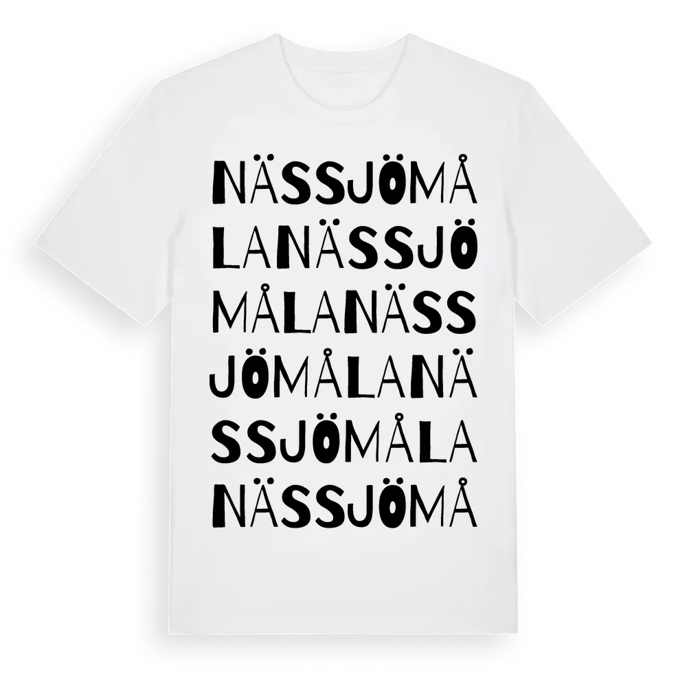 Nässjömåla ordlek t-shirt är inspirerad av byn Nässjömåla i Kalmar län, Sverige. Tröjan är designad för dig som har en speciell koppling till platsen – oavsett om du bor här, har rötterna här eller bara älskar Nässjömåla.