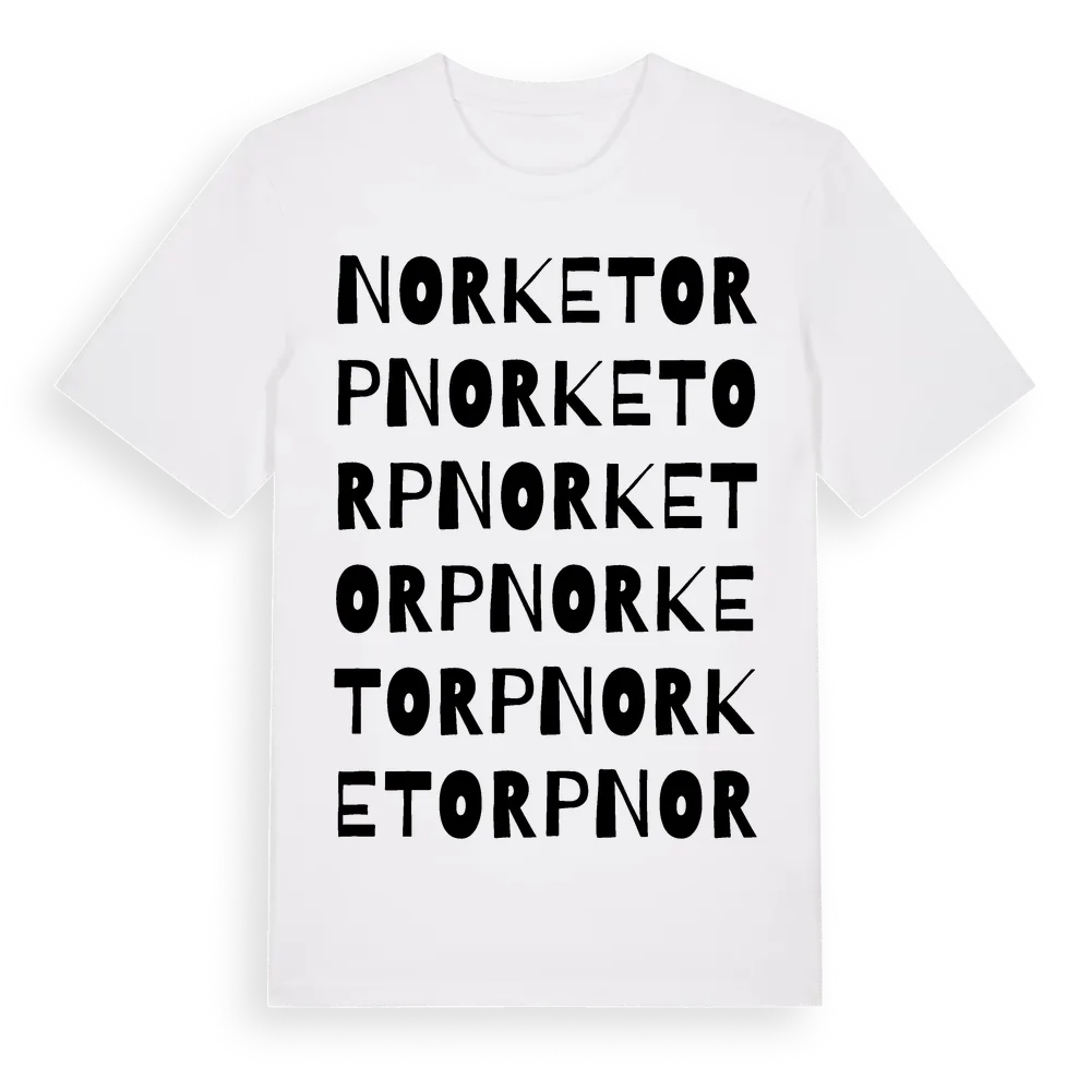 Norketorp ordlek t-shirt är inspirerad av byn Norketorp i Kalmar län, Sverige. Tröjan är designad för dig som har en speciell koppling till platsen – oavsett om du bor här, har rötterna här eller bara älskar Norketorp.