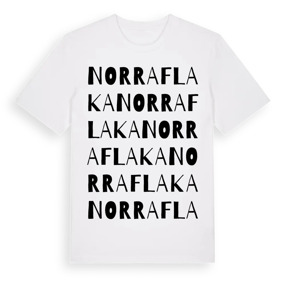 Norra Flaka ordlek t-shirt är inspirerad av byn Norra Flaka i Kalmar län, Sverige. Tröjan är designad för dig som har en speciell koppling till platsen – oavsett om du bor här, har rötterna här eller bara älskar Norra Flaka.