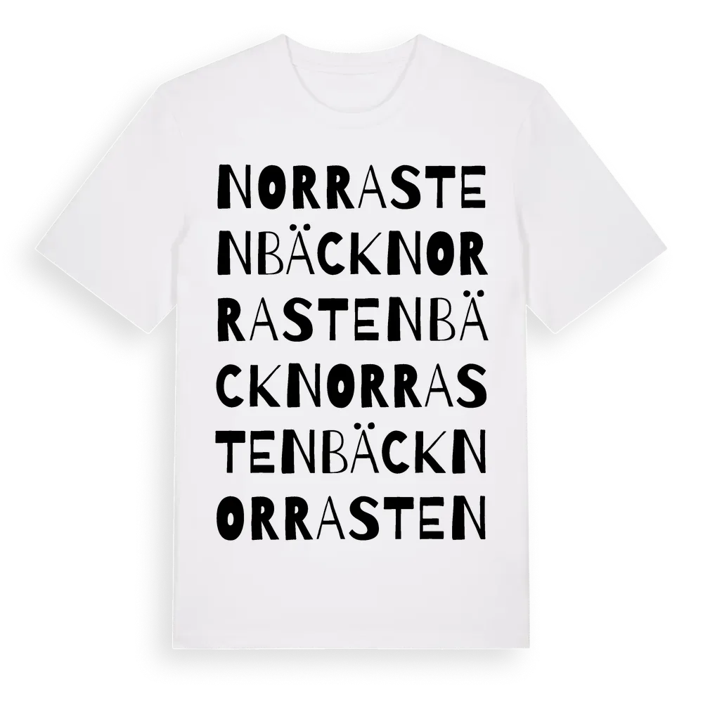 Norra Stenbäck ordlek t-shirt är inspirerad av byn Norra Stenbäck i Kalmar län, Sverige. Tröjan är designad för dig som har en speciell koppling till platsen – oavsett om du bor här, har rötterna här eller bara älskar Norra Stenbäck.