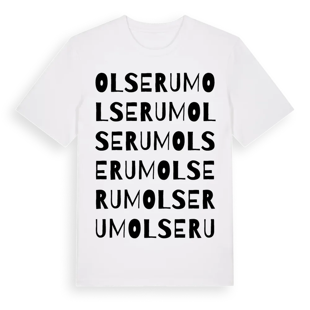 Olserum ordlek t-shirt är inspirerad av Olserum i Kalmar län, Sverige. Tröjan är designad för dig som har en speciell koppling till platsen – oavsett om du bor här, har rötterna här eller bara älskar Olserum.