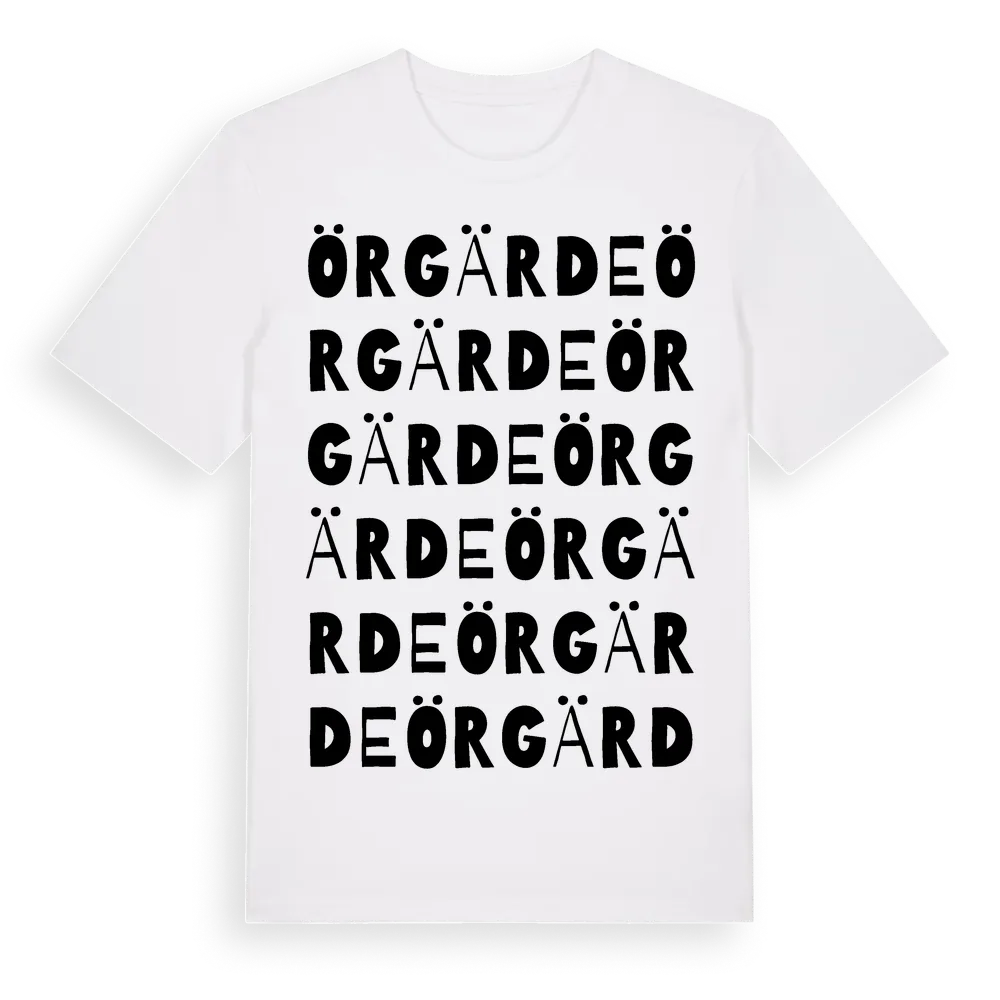 Örgärde ordlek t-shirt är inspirerad av Örgärde i Kalmar län, Sverige. Tröjan är designad för dig som har en speciell koppling till platsen – oavsett om du bor här, har rötterna här eller bara älskar Örgärde.