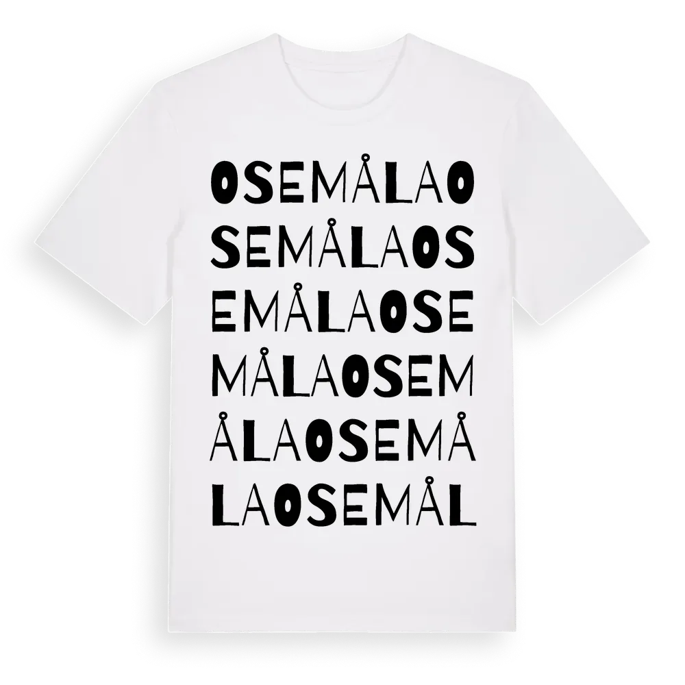 Osemåla ordlek t-shirt är inspirerad av byn Osemåla i Kalmar län, Sverige. Tröjan är designad för dig som har en speciell koppling till platsen – oavsett om du bor här, har rötterna här eller bara älskar Osemåla.