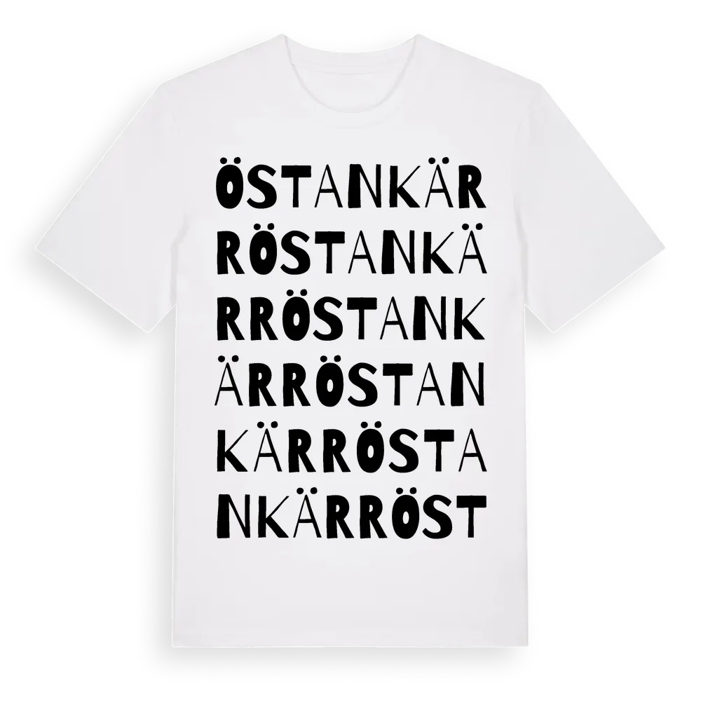Östankärr ordlek t-shirt är inspirerad av byn Östankärr i Kalmar län, Sverige. Tröjan är designad för dig som har en speciell koppling till platsen – oavsett om du bor här, har rötterna här eller bara älskar Östankärr.