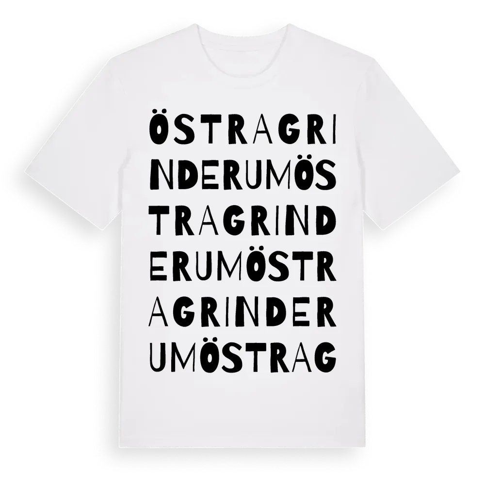 Östra Grinderum ordlek t-shirt är inspirerad av byn Östra Grinderum i Kalmar län, Sverige. Tröjan är designad för dig som har en speciell koppling till platsen – oavsett om du bor här, har rötterna här eller bara älskar Östra Grinderum.