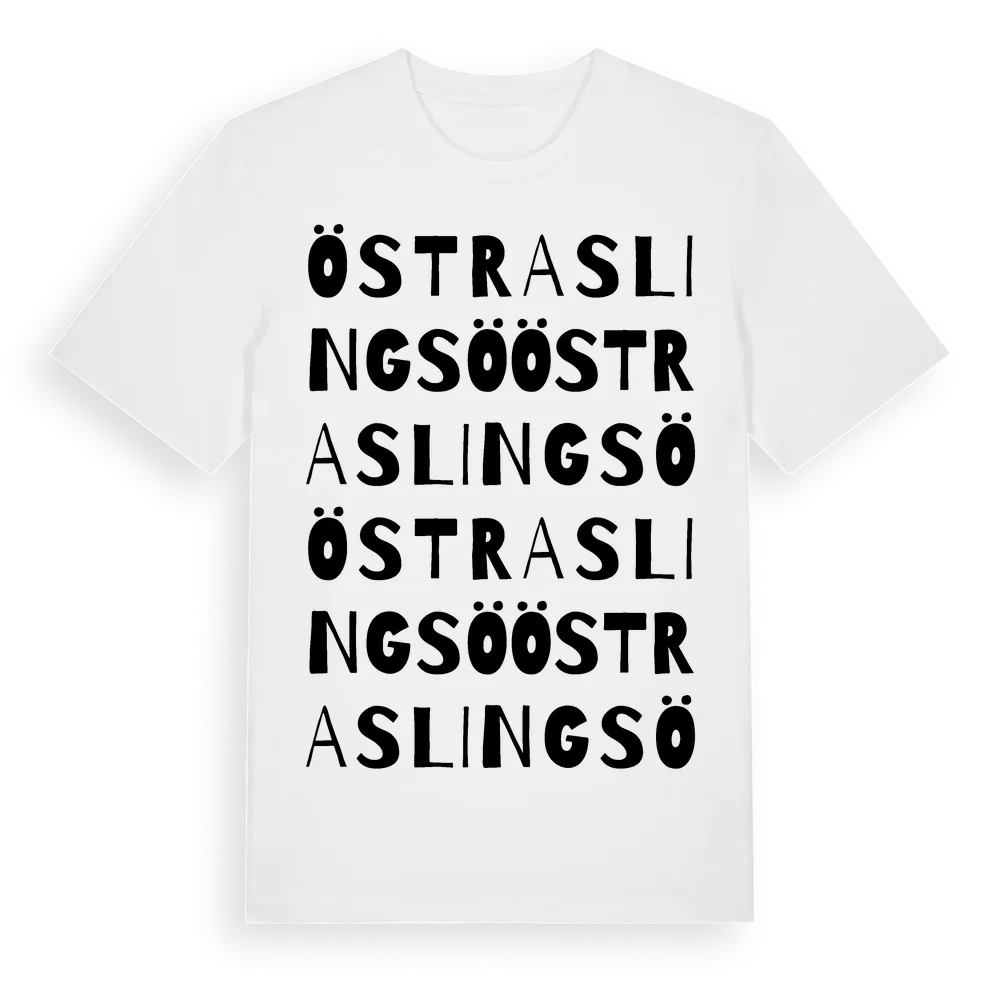 Östra Slingsö ordlek t-shirt är inspirerad av Östra Slingsö i Kalmar län, Sverige. Tröjan är designad för dig som har en speciell koppling till platsen – oavsett om du bor här, har rötterna här eller bara älskar Östra Slingsö.
