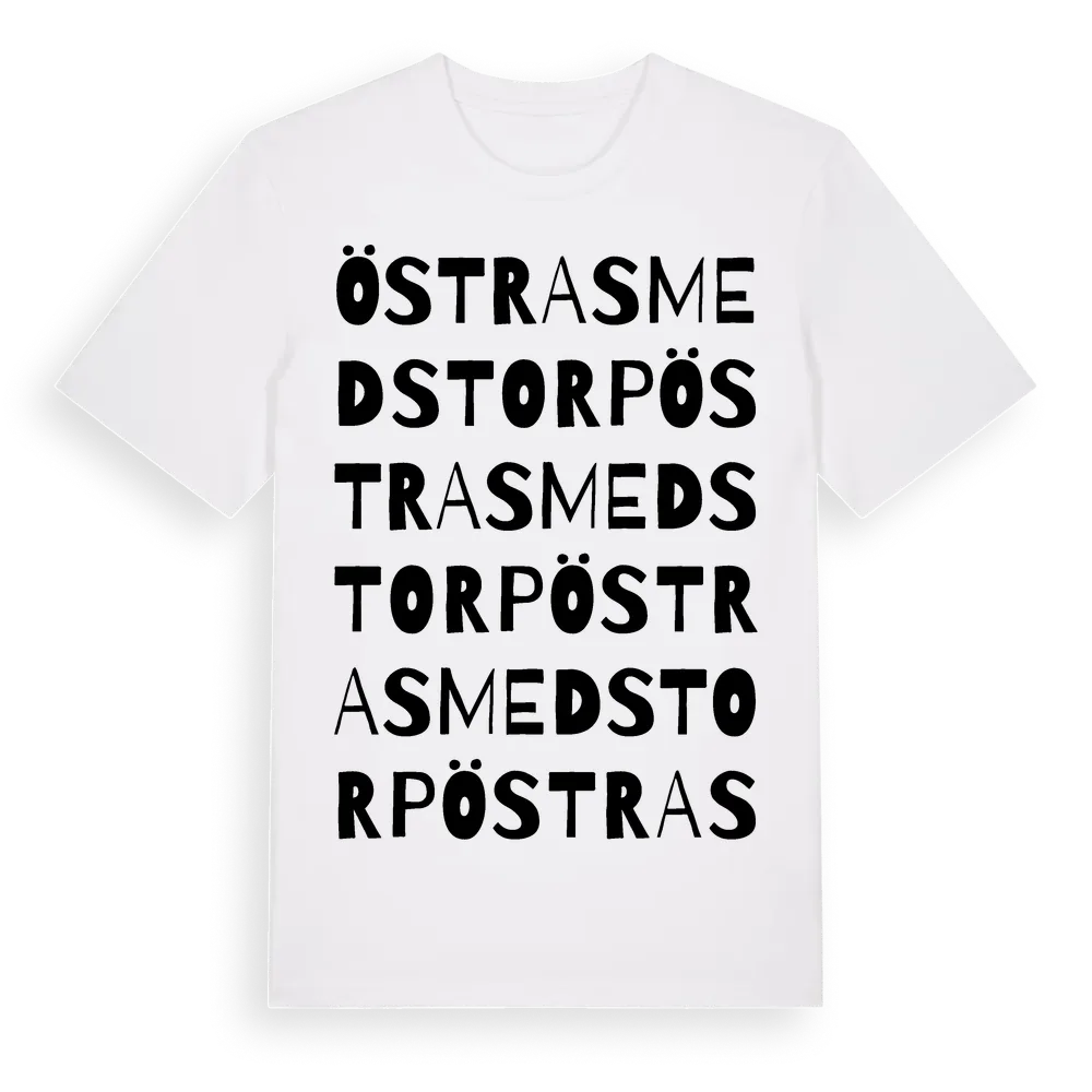 Östra Smedstorp ordlek t-shirt är inspirerad av Östra Smedstorp i Kalmar län, Sverige. Tröjan är designad för dig som har en speciell koppling till platsen – oavsett om du bor här, har rötterna här eller bara älskar Östra Smedstorp.