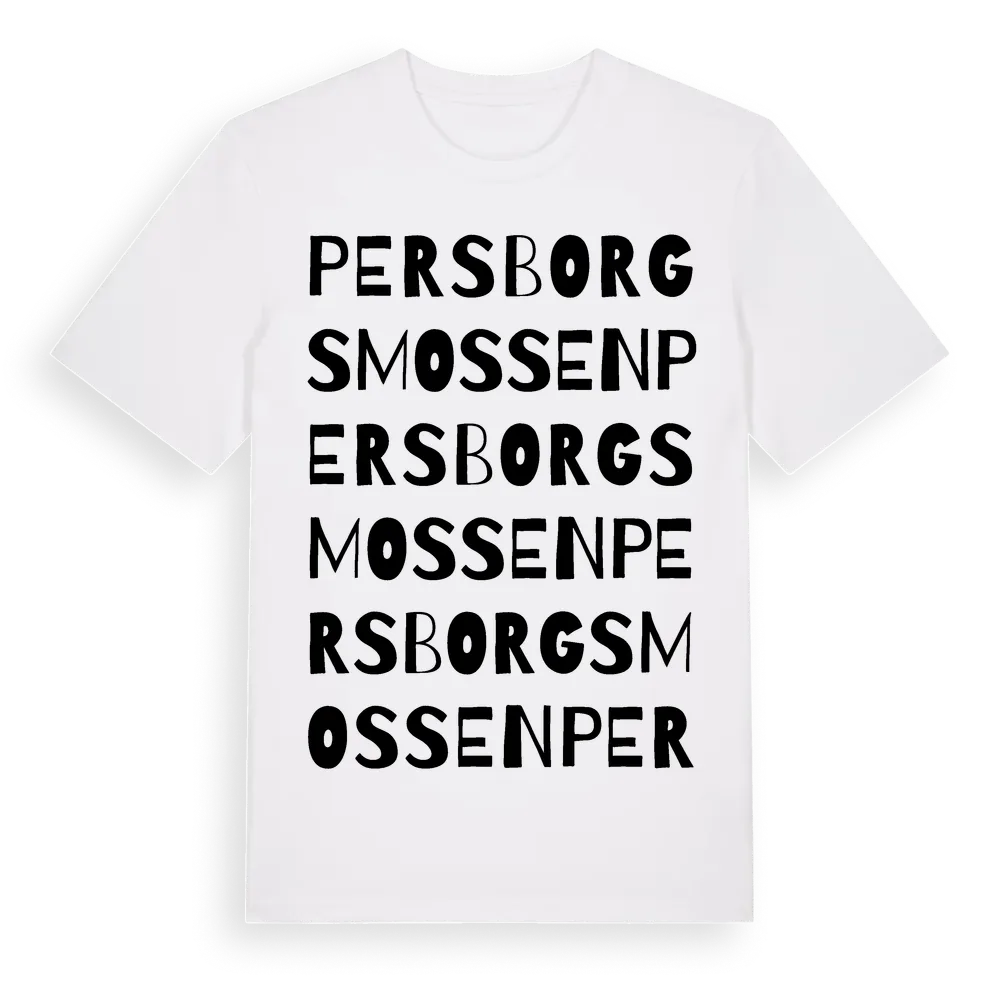 Persborgsmossen ordlek t-shirt är inspirerad av stadsdelen Persborgsmossen i Kalmar län, Sverige. Tröjan är designad för dig som har en speciell koppling till platsen – oavsett om du bor här, har rötterna här eller bara älskar Persborgsmossen.
