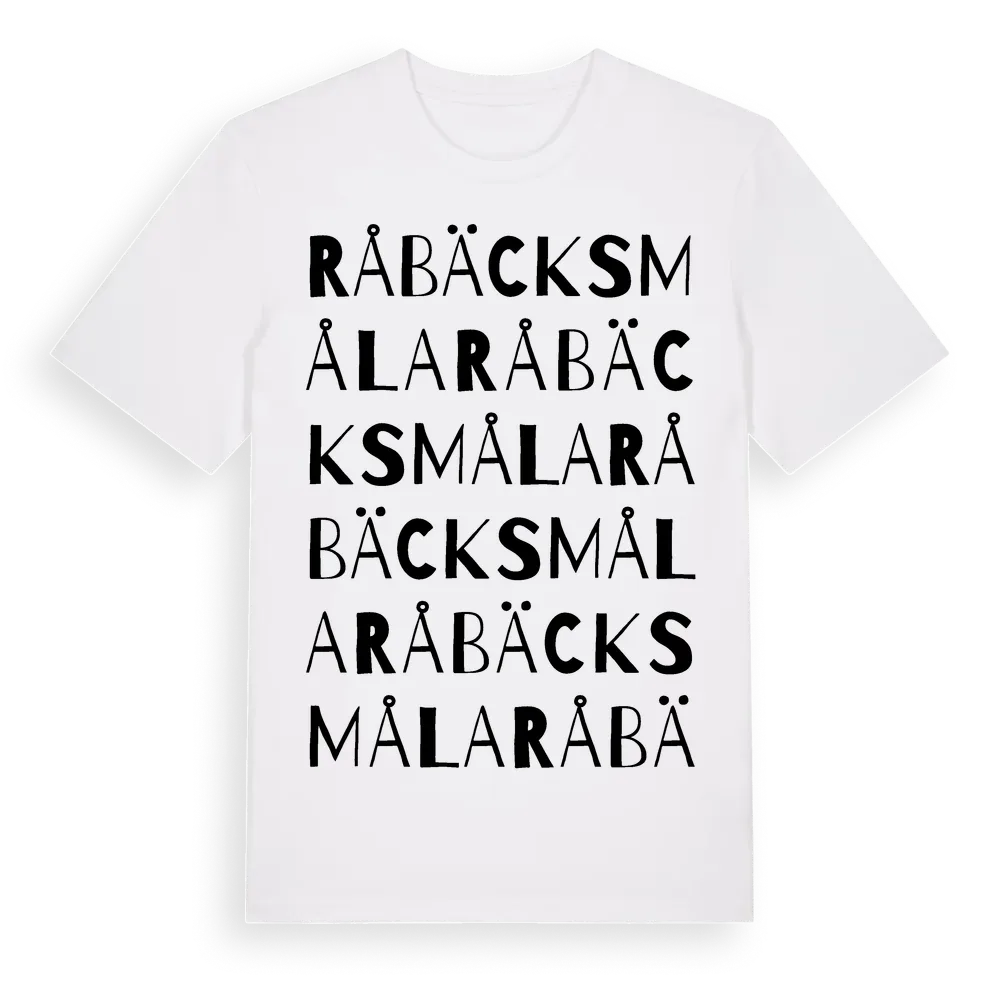 Råbäcksmåla ordlek t-shirt är inspirerad av byn Råbäcksmåla i Kalmar län, Sverige. Tröjan är designad för dig som har en speciell koppling till platsen – oavsett om du bor här, har rötterna här eller bara älskar Råbäcksmåla.