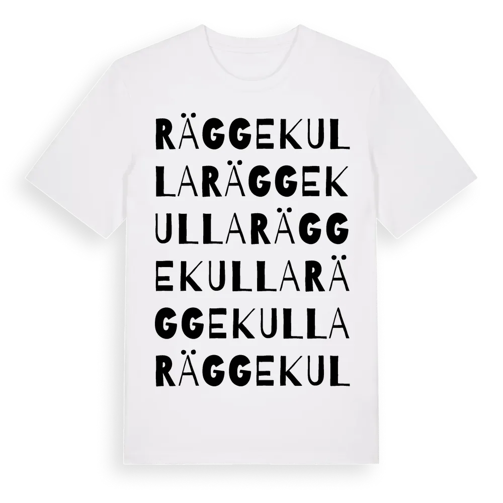 Räggekulla ordlek t-shirt är inspirerad av byn Räggekulla i Kalmar län, Sverige. Tröjan är designad för dig som har en speciell koppling till platsen – oavsett om du bor här, har rötterna här eller bara älskar Räggekulla.