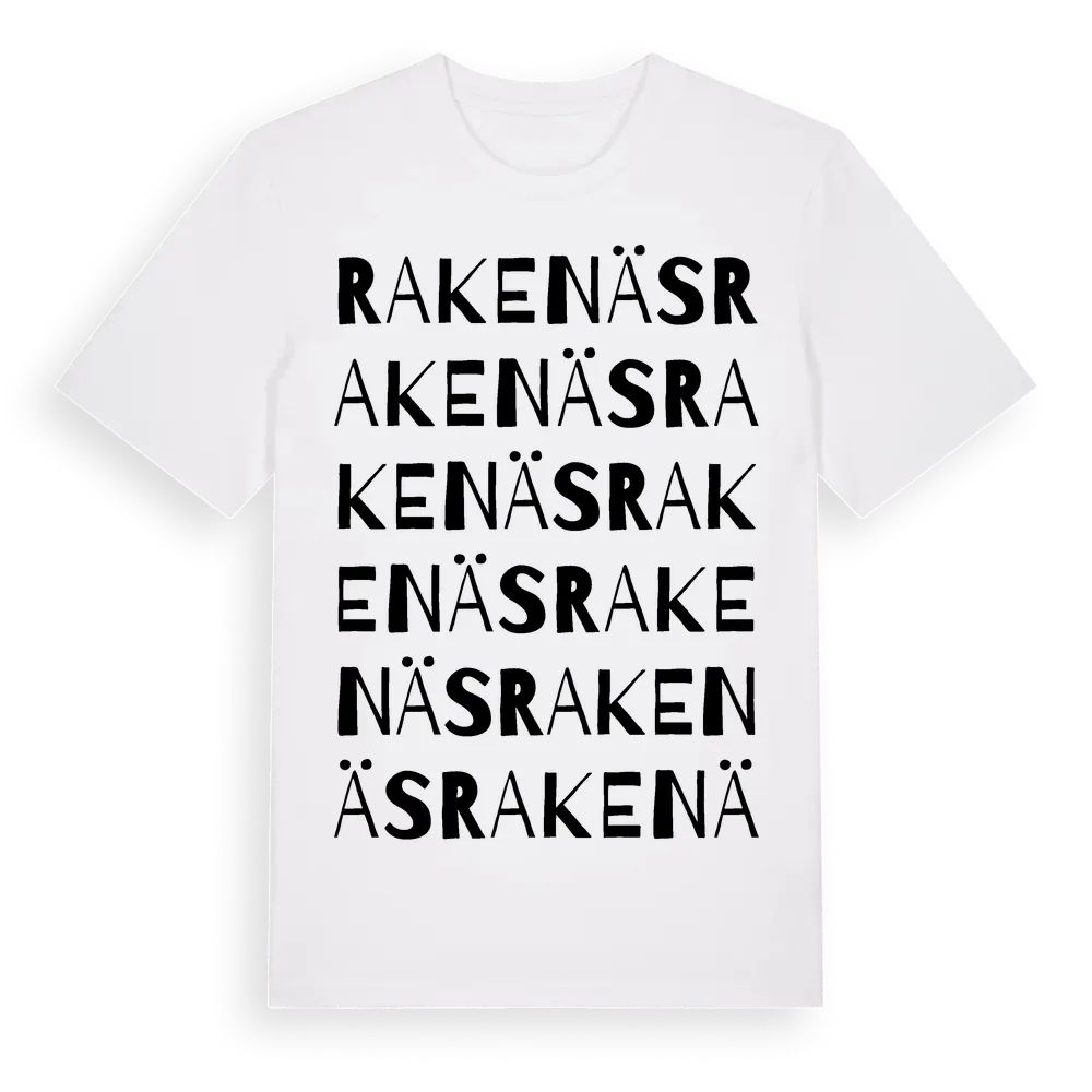 Rakenäs ordlek t-shirt är inspirerad av byn Rakenäs i Kalmar län, Sverige. Tröjan är designad för dig som har en speciell koppling till platsen – oavsett om du bor här, har rötterna här eller bara älskar Rakenäs.