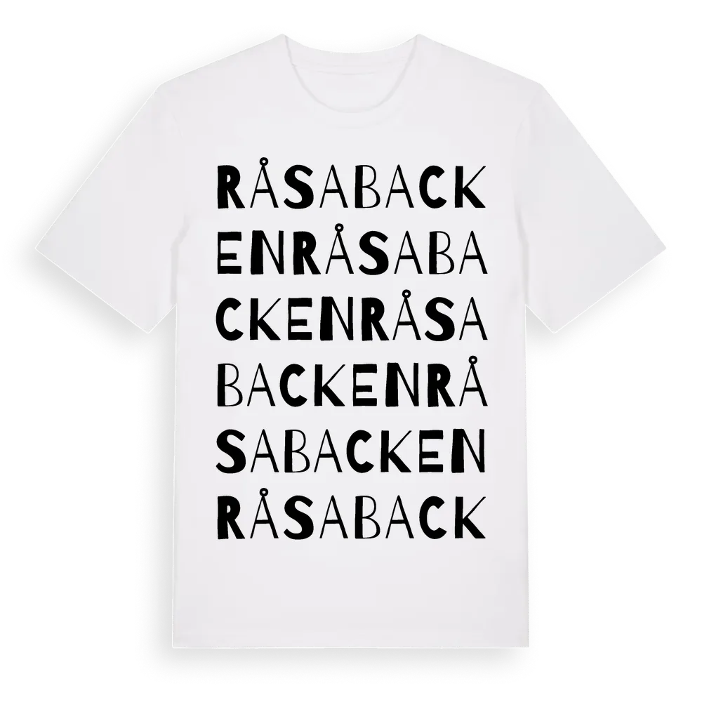 Råsabacken ordlek t-shirt är inspirerad av Råsabacken i Kalmar län, Sverige. Tröjan är designad för dig som har en speciell koppling till platsen – oavsett om du bor här, har rötterna här eller bara älskar Råsabacken.
