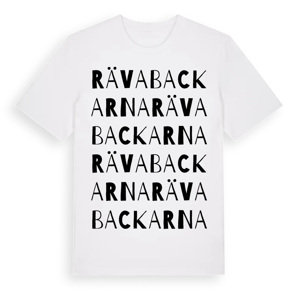 Rävabackarna ordlek t-shirt är inspirerad av Rävabackarna i Kalmar län, Sverige. Tröjan är designad för dig som har en speciell koppling till platsen – oavsett om du bor här, har rötterna här eller bara älskar Rävabackarna.