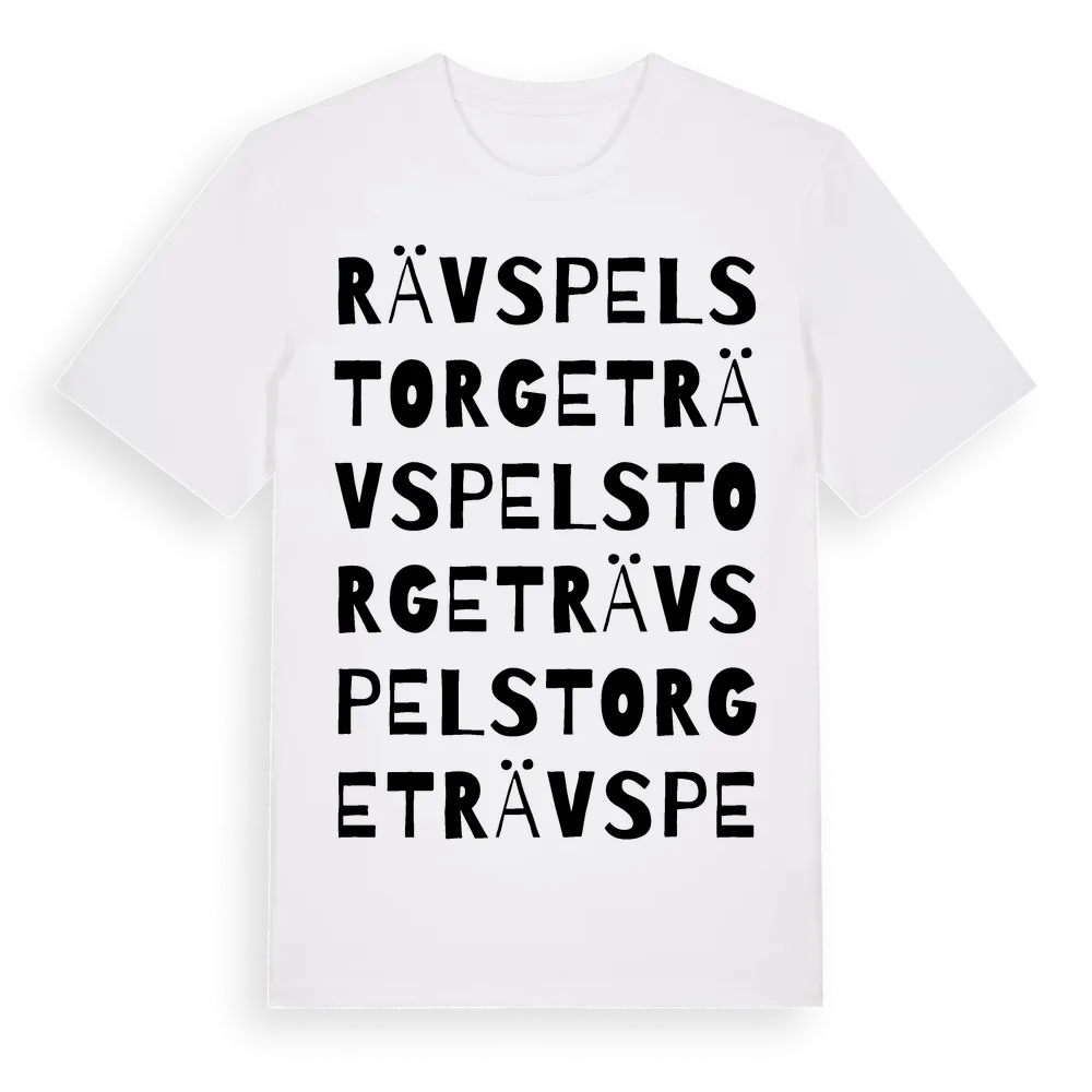 Rävspelstorget ordlek t-shirt är inspirerad av Rävspelstorget i Kalmar län, Sverige. Tröjan är designad för dig som har en speciell koppling till platsen – oavsett om du bor här, har rötterna här eller bara älskar Rävspelstorget.