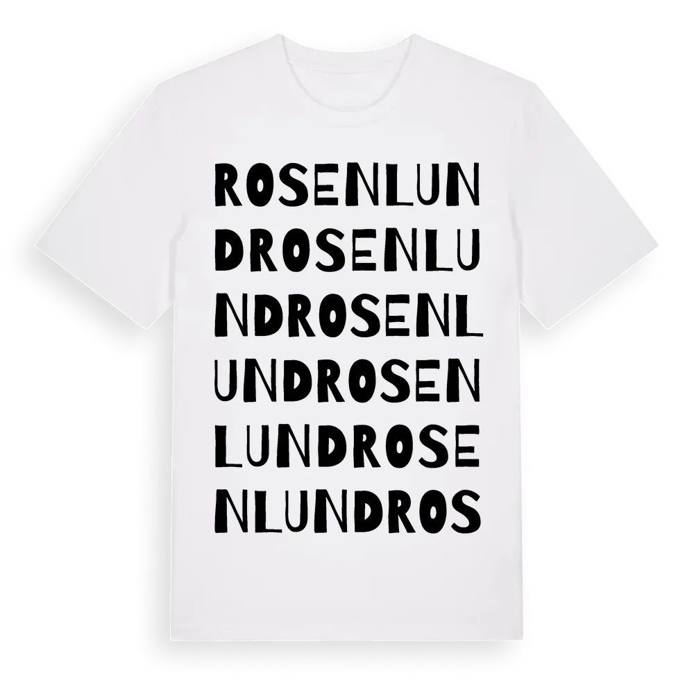 Rosenlund ordlek t-shirt är inspirerad av Rosenlund i Kalmar län, Sverige. Tröjan är designad för dig som har en speciell koppling till platsen – oavsett om du bor här, har rötterna här eller bara älskar Rosenlund.