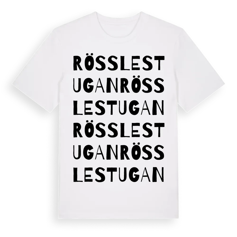 Rösslestugan ordlek t-shirt är inspirerad av Rösslestugan i Kalmar län, Sverige. Tröjan är designad för dig som har en speciell koppling till platsen – oavsett om du bor här, har rötterna här eller bara älskar Rösslestugan.