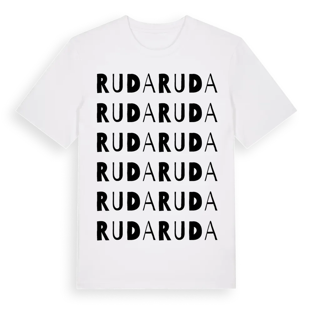 Ruda ordlek t-shirt är inspirerad av byn Ruda i Kalmar län, Sverige. Tröjan är designad för dig som har en speciell koppling till platsen – oavsett om du bor här, har rötterna här eller bara älskar Ruda.