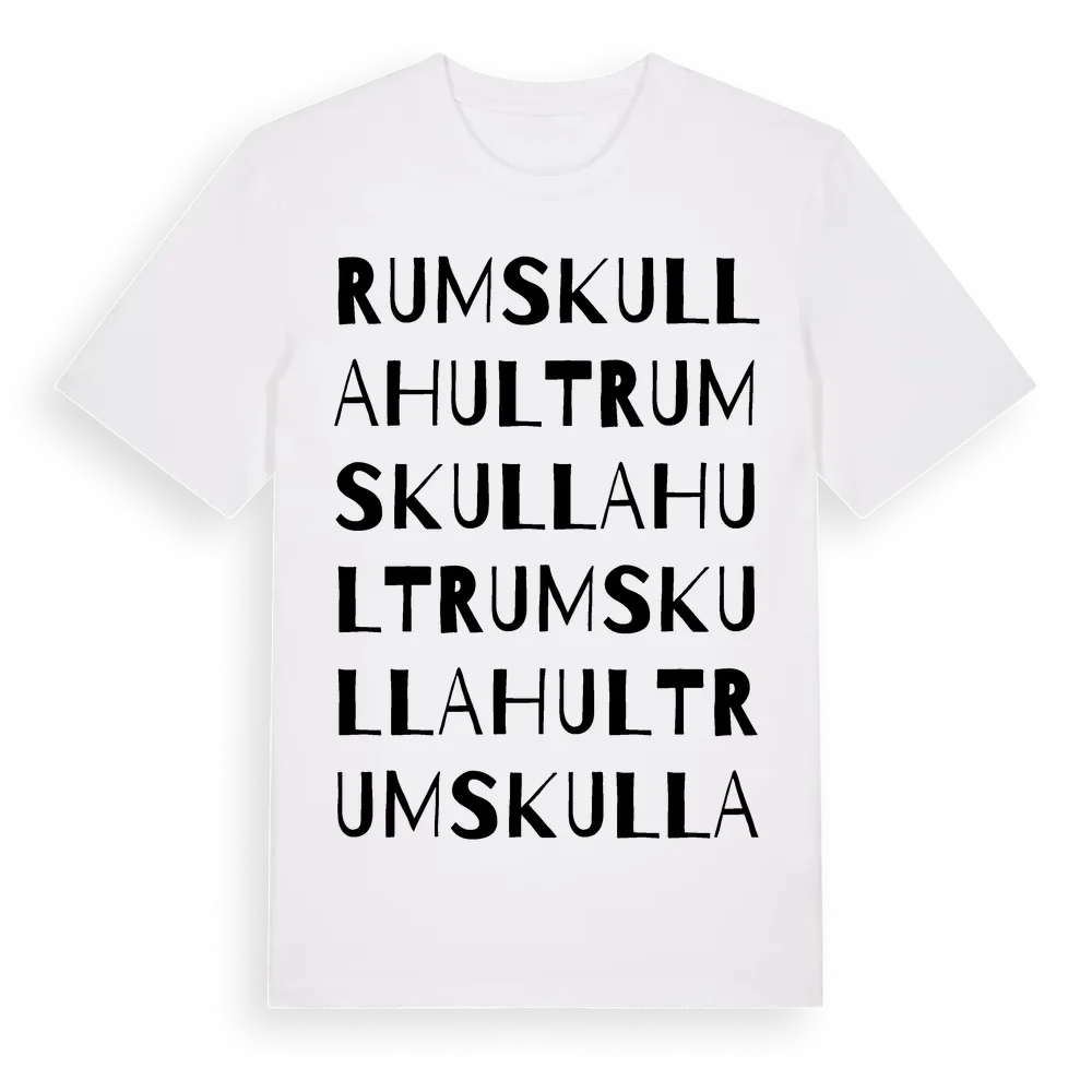 Rumskullahult ordlek t-shirt är inspirerad av Rumskullahult i Kalmar län, Sverige. Tröjan är designad för dig som har en speciell koppling till platsen – oavsett om du bor här, har rötterna här eller bara älskar Rumskullahult.