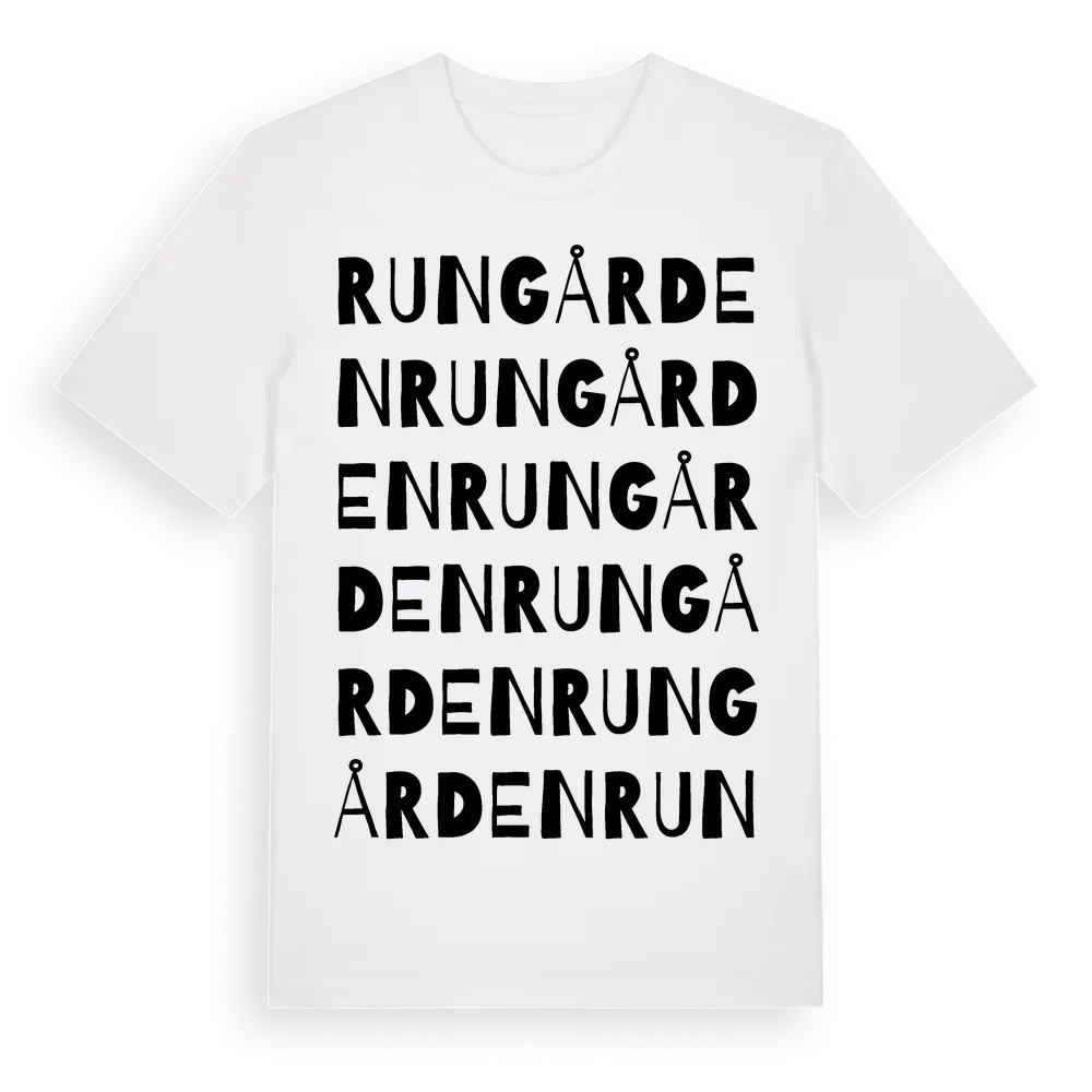 Rungården ordlek t-shirt är inspirerad av Rungården i Kalmar län, Sverige. Tröjan är designad för dig som har en speciell koppling till platsen – oavsett om du bor här, har rötterna här eller bara älskar Rungården.