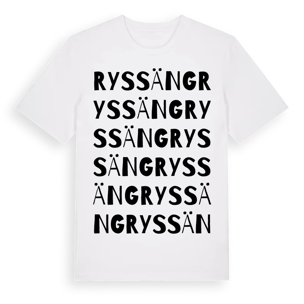 En ordlek byggd på Ryssängs namn. Subtilt och klurig – ett motiv som bara de som verkligen känner platsen fullt ut förstår. Premium bomull, unisex – från Ryssäng i Kalmar län.