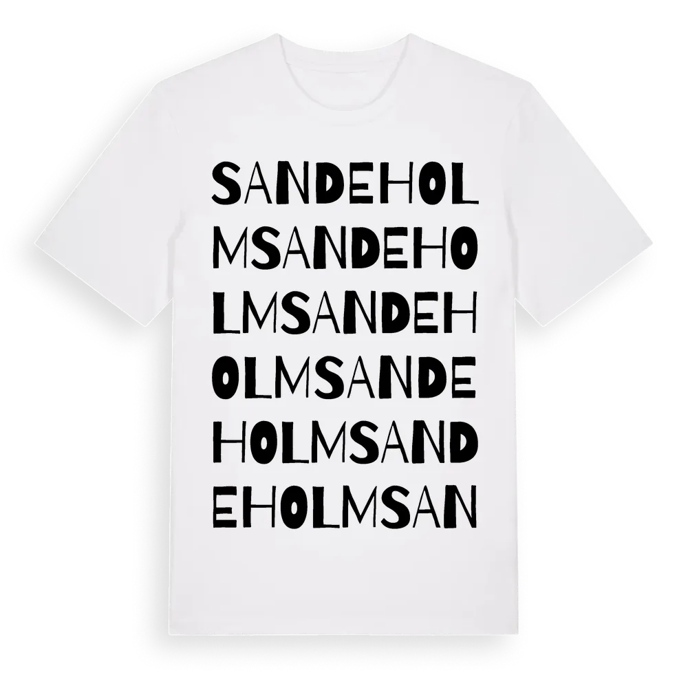 Sandeholm ordlek t-shirt är inspirerad av Sandeholm i Kalmar län, Sverige. Tröjan är designad för dig som har en speciell koppling till platsen – oavsett om du bor här, har rötterna här eller bara älskar Sandeholm.
