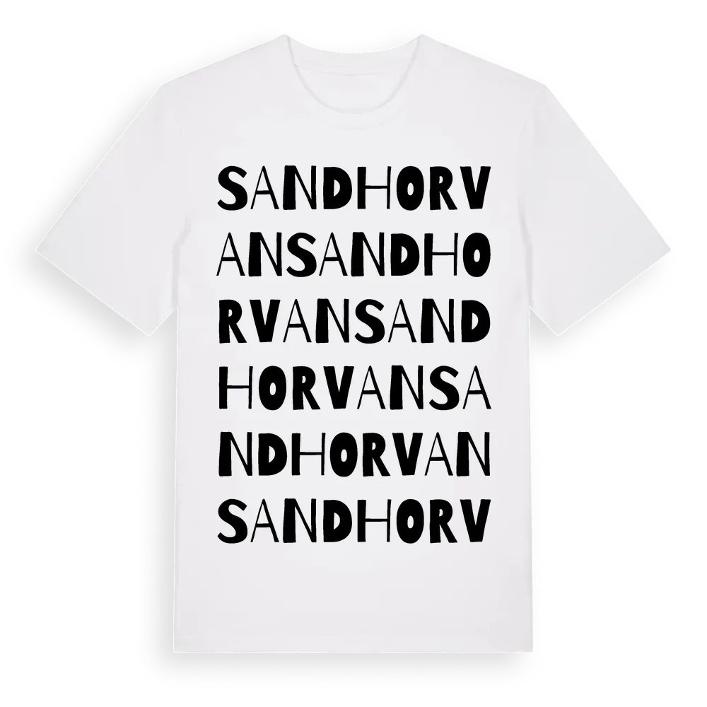 Sandhorvan ordlek t-shirt är inspirerad av Sandhorvan i Kalmar län, Sverige. Tröjan är designad för dig som har en speciell koppling till platsen – oavsett om du bor här, har rötterna här eller bara älskar Sandhorvan.