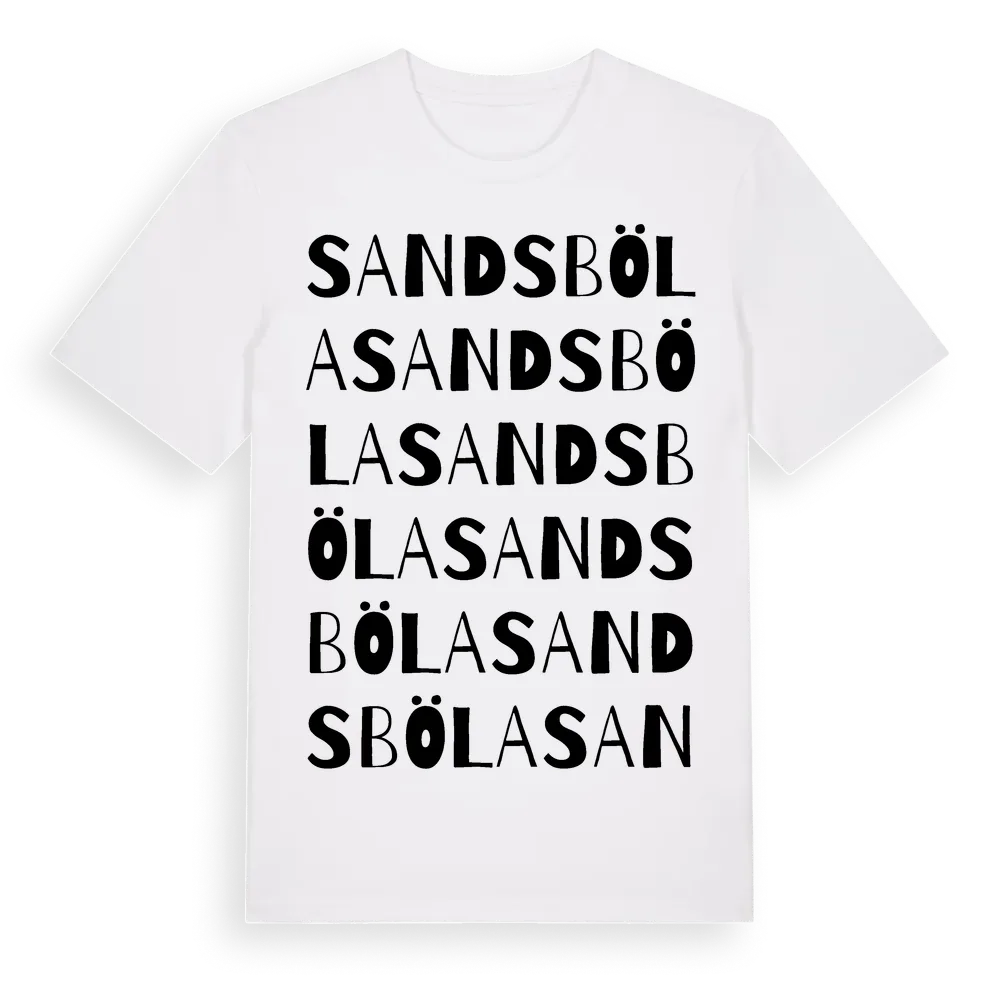 Sandsböla ordlek t-shirt är inspirerad av Sandsböla i Kalmar län, Sverige. Tröjan är designad för dig som har en speciell koppling till platsen – oavsett om du bor här, har rötterna här eller bara älskar Sandsböla.
